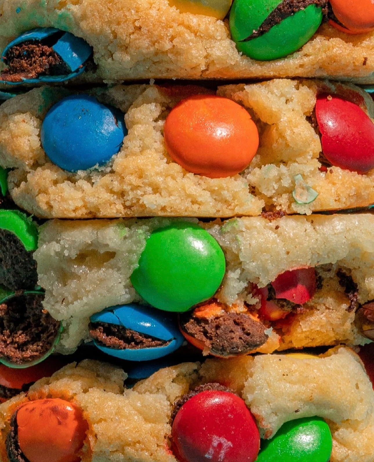 Our brown butter-based cookies, inspired by childhood favorite treats, are loaded with fun fillings and toppings. Crispy on the outside with chewy centers, these goodies are ready to give you a culminating cookie experience.