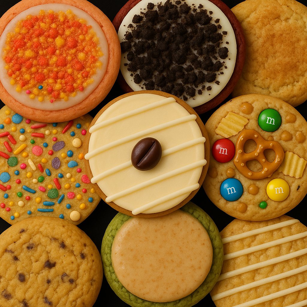 Our brown butter-based cookies, inspired by childhood favorite treats, are loaded with fun fillings and toppings. Crispy on the outside with chewy centers, these goodies are ready to give you a culminating cookie experience.